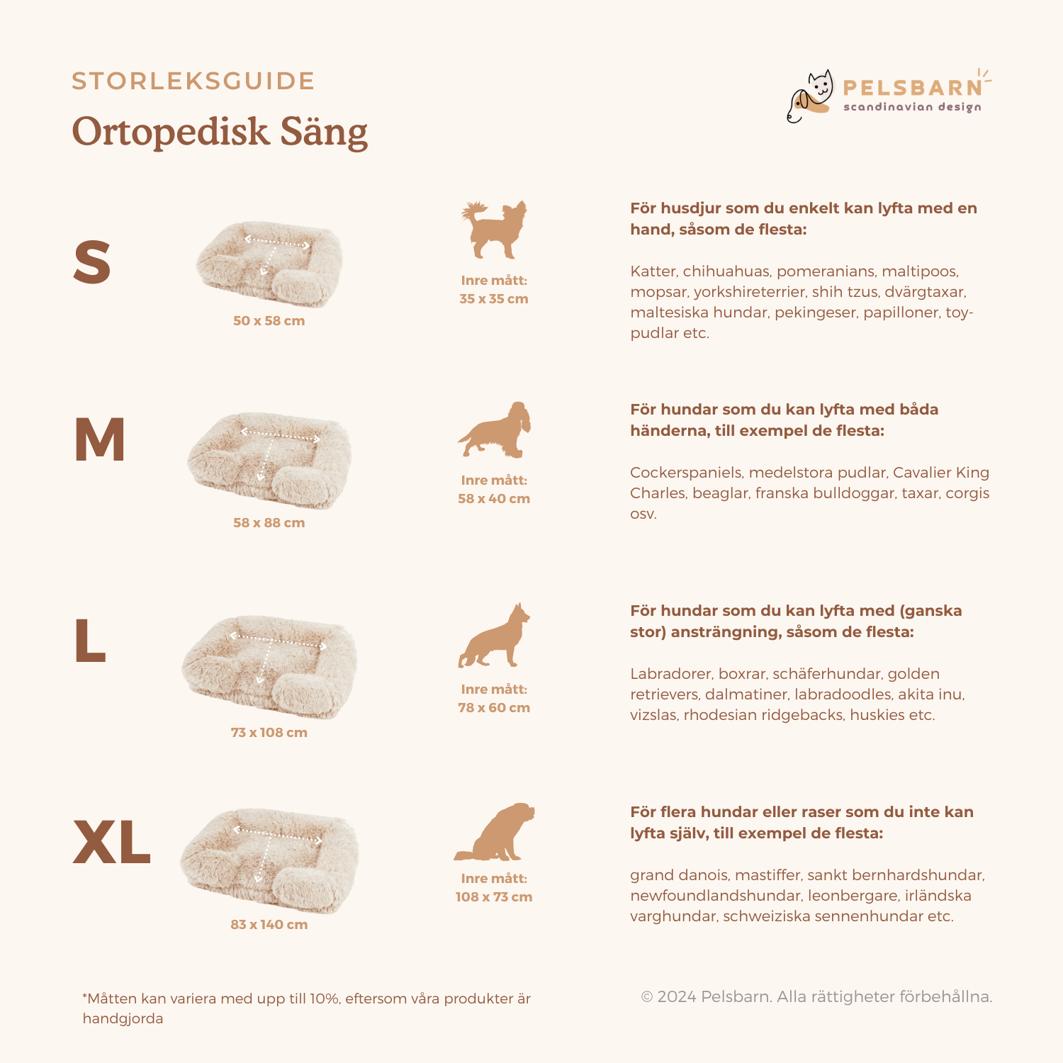 Om du är osäker på storleken på Ortopedisk lugnande hundsäng kan du ta en titt på vår storleksguide nedan. Om du är mellan två storlekar, välj den större storleken för mer komfort för din hund!