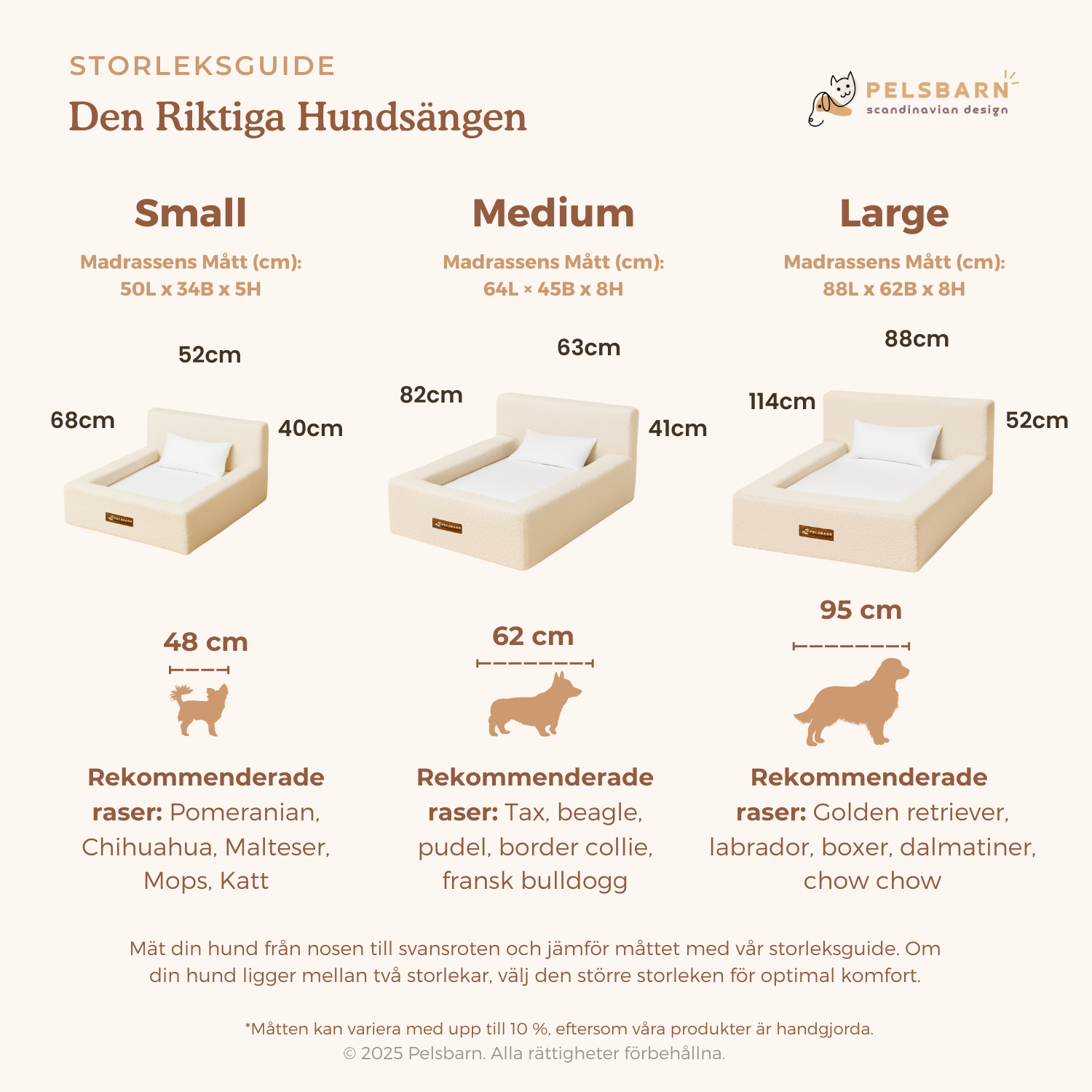 Om du är osäker på storleken på den Riktiga Ortopediska Hundsängen, ta en titt på vår storleksguide nedan. Om du ligger mellan två storlekar, välj den större storleken för att din hund ska få mer komfort!