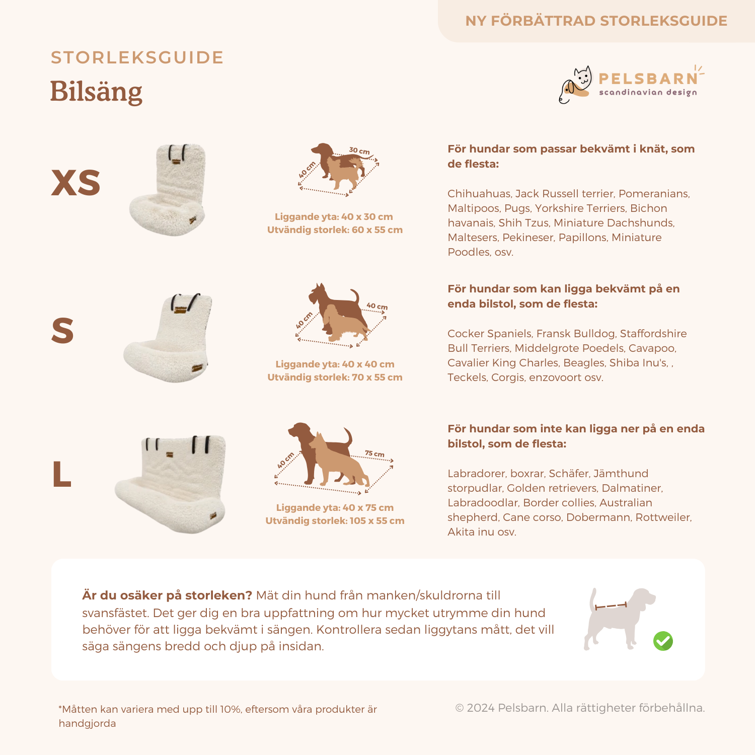 Skyddande Bilsäng StorleksguideUppdaterad 2 months agoOm du är osäker på storleken på bilsängen kan du titta på vår storleksguide nedan. Om du är tveksam mellan två storlekar, välj den större storleken för mer komfort för din hund! Var denna artikel till hjälp? JaNej